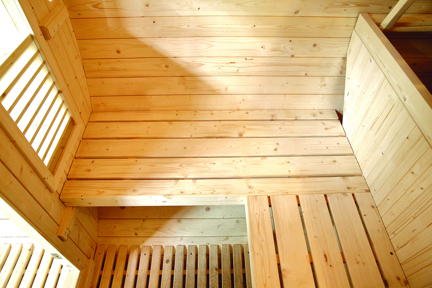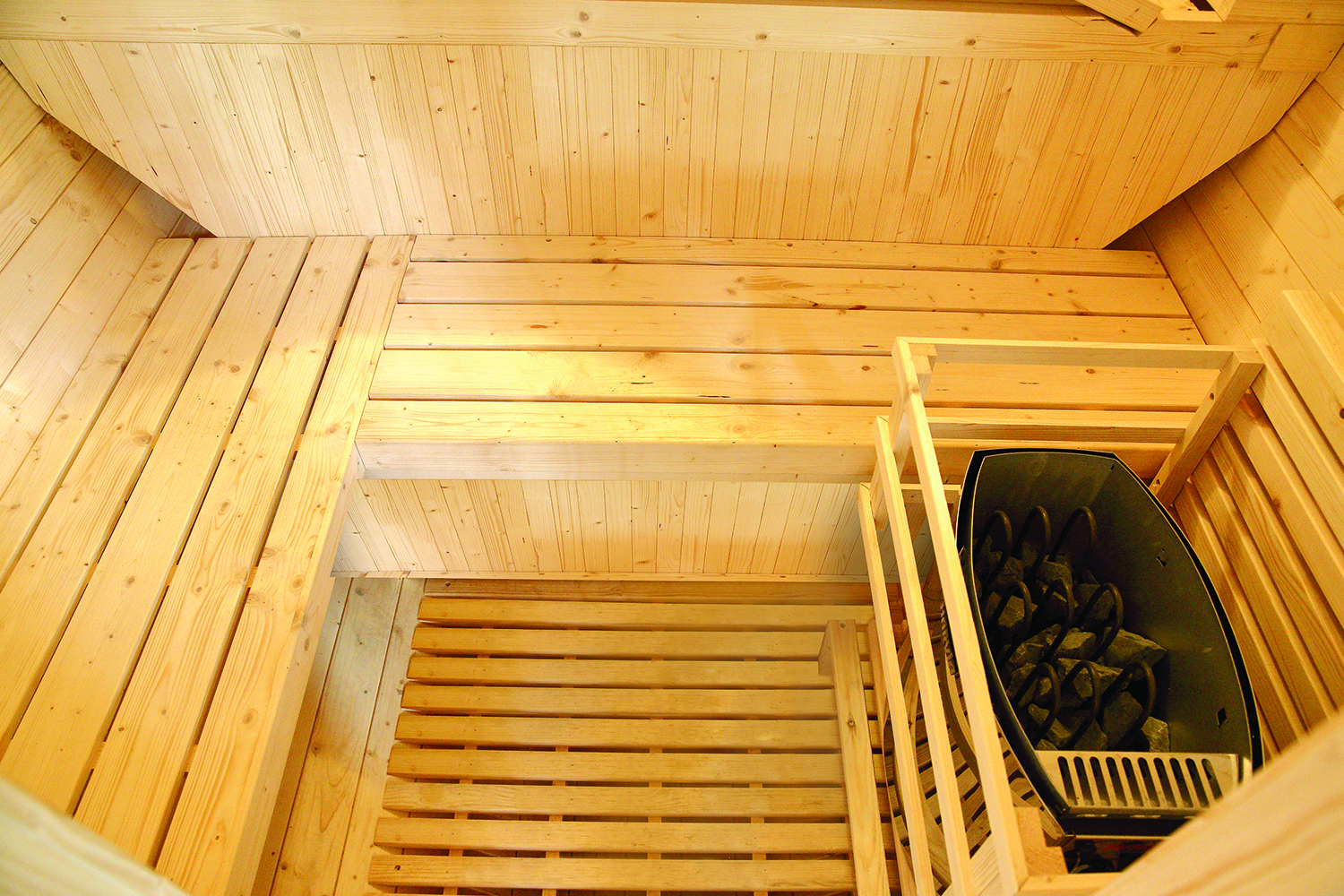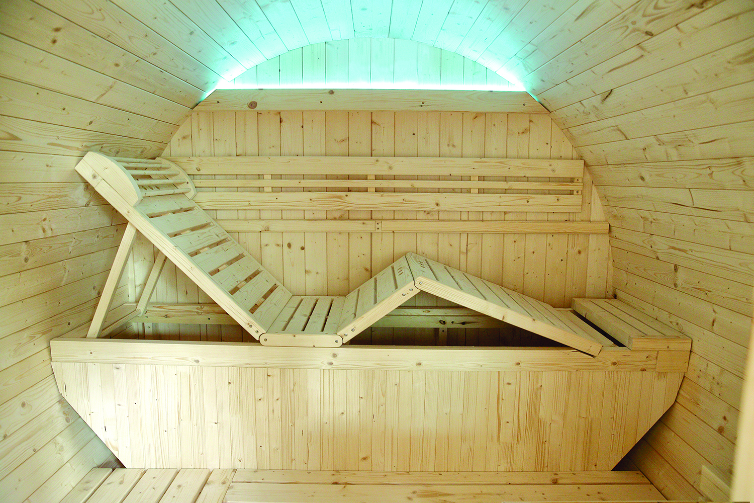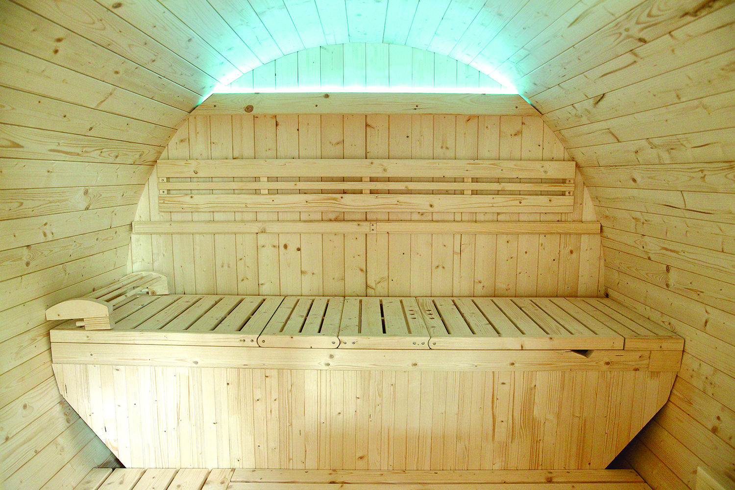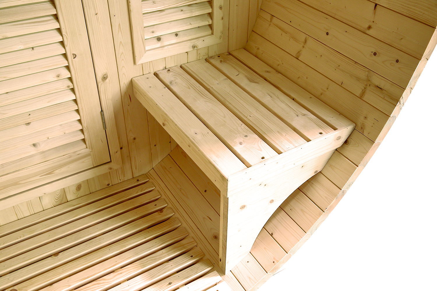 Equipamentos e acessórios: Banco duplo em dois níveis Banco superior ergonômico ajustável e retrátil com encosto de cabeça integrado Balde, concha, ampulheta, termômetro e higrômetro inclusos